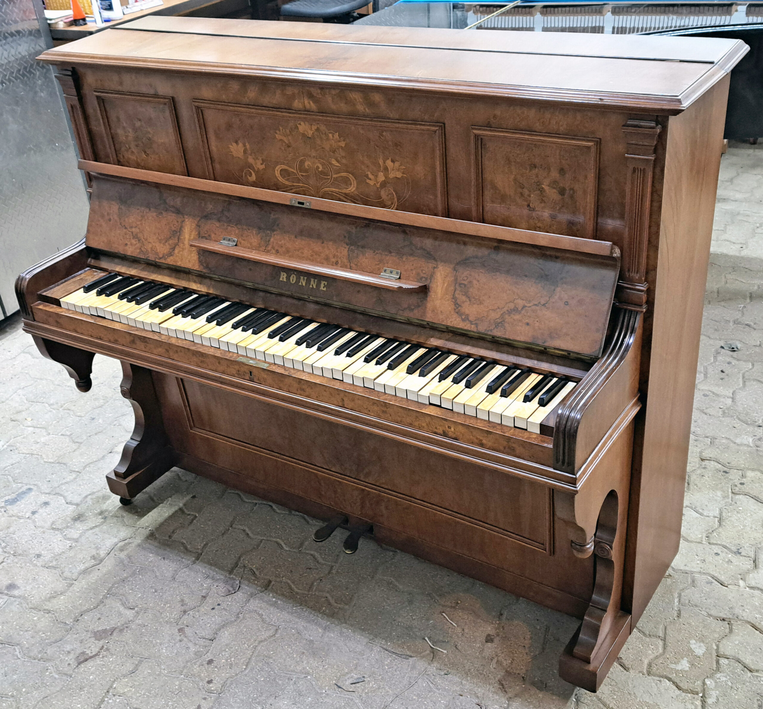 We changed out part of the original lid with the fallboard so that the original brass lettering stating the piano make (A Bord), location (Paris) and date (1878) could remain.